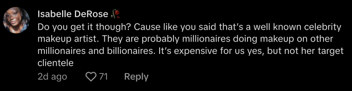 “Do you get it though?” explained @derosebeauty, “Because like you said that’s a well known celebrity makeup artist. They are probably millionaires doing makeup on other millionaires and billionaires. It’s expensive for us, yes, but not for her target clientele.”