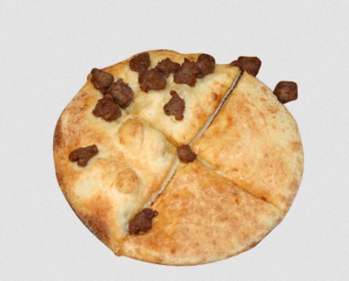 It was close, but the whole pizza was so small and light it must have shifted during delivery. And the little beef pellets didn't have any sauce or cheese to hang on to, so a few lost their footing from the left half.