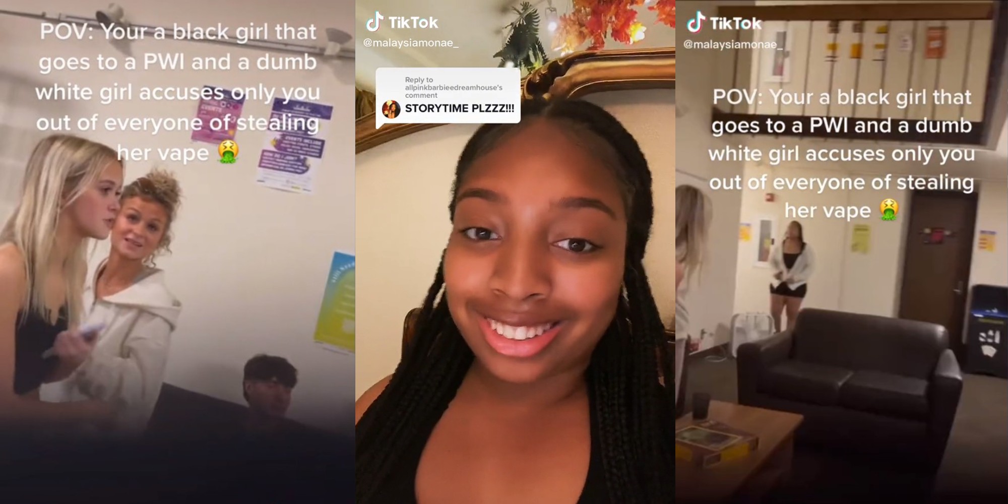 In the video posted by TikToker Malaysia Stewart (@malaysiamonae_) on July 7, she shows a clip of a girl confronting her in the lobby of their dorm. In the caption, she explains that this was one of the "worst moments" at her PWI (Predominantly White Institution) university.
