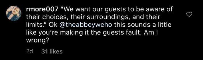 "'We want our guests to be aware of their choices, their surroundings, and their limits.' Ok [The Abbey] this sounds a little like you're making it the guests fault. Am I wrong?" one commenter under the statement said. The Abbey has limited comments on the post.