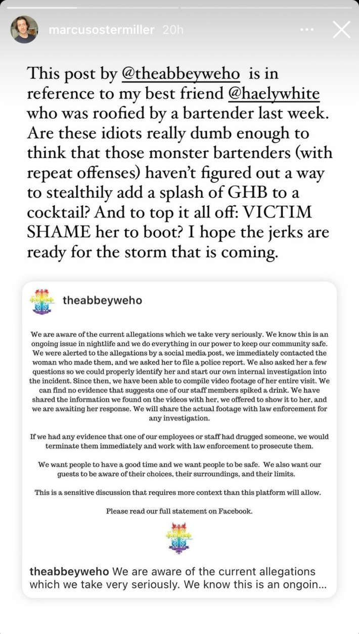 A woman on Instagram recently shared her experience allegedly getting drugged at The Abbey, a popular gay bar in Los Angeles.