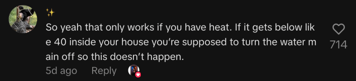 "So yeah that only works if you have heat," replied another helpful commenter. "If it gets below like 40 inside your house you’re supposed to turn the water main off so this doesn’t happen."