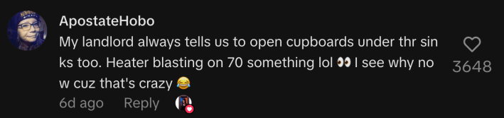 “My landlord always tells us to open cupboards under thr sinks too. Heater blasting on 70 something lol 👀 I see why now cuz that's crazy 😂,” wrote @apostatehobo.