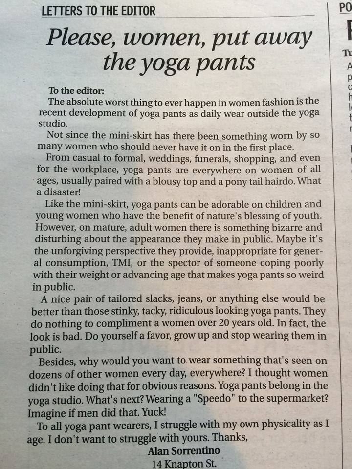 It all started when Alan Sorrentino wrote a letter to the editor in the Barrington Times about the national scourge that is (apparently) yoga pants. “The absolute worst thing to ever happen in women fashion is the recent development of yoga pants as daily wear outside the yoga studio,” wrote Sorrentino. The absolute worst! To “women fashion”!