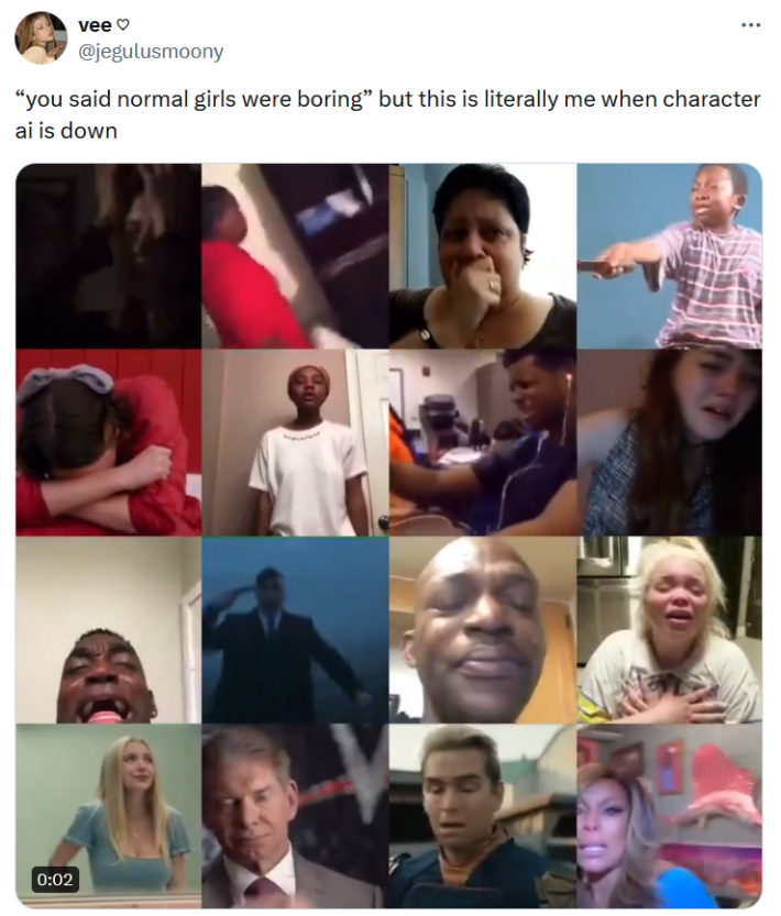 The actual meme derived from this part of the song didn't emerge until the very end of May. Twitter user @jegulusmoony posted one of the first popular examples on May 28, writing "'you said normal girls were boring' but this is literally me when character ai is down" with a gif compilation of people freaking out and crying.