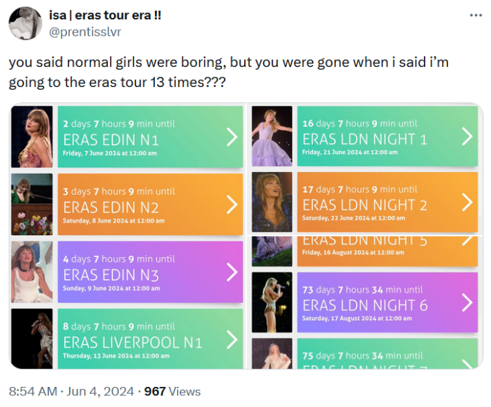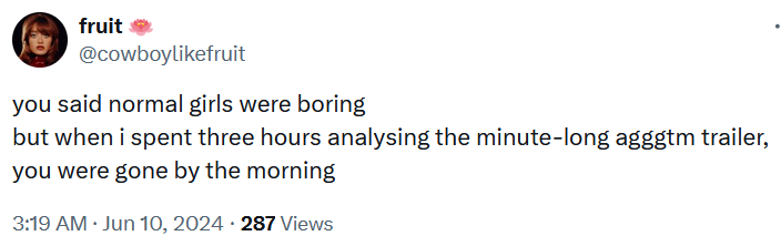 Swifties enjoyed the line "you said normal girls were boring, but you were gone by the morning" so much that they started by posting the lyrics on social media alongside images or footage of people screaming, sobbing, smashing things with blunt instruments, and other highly dramatic and emotional acts.