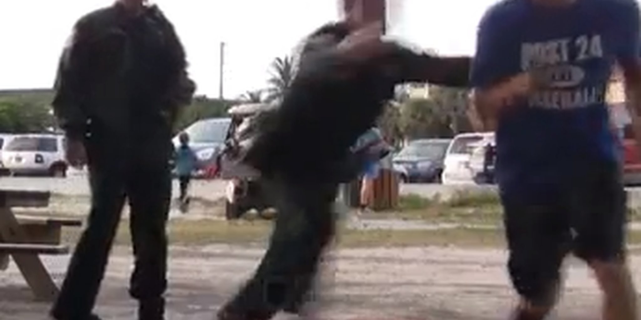 Ross takes one step onto the picnic table then flips over the cop on the right, landing on his feet before scurrying away. He comes back into the frame a few seconds later, only to be questioned by the cop he just hurdled.